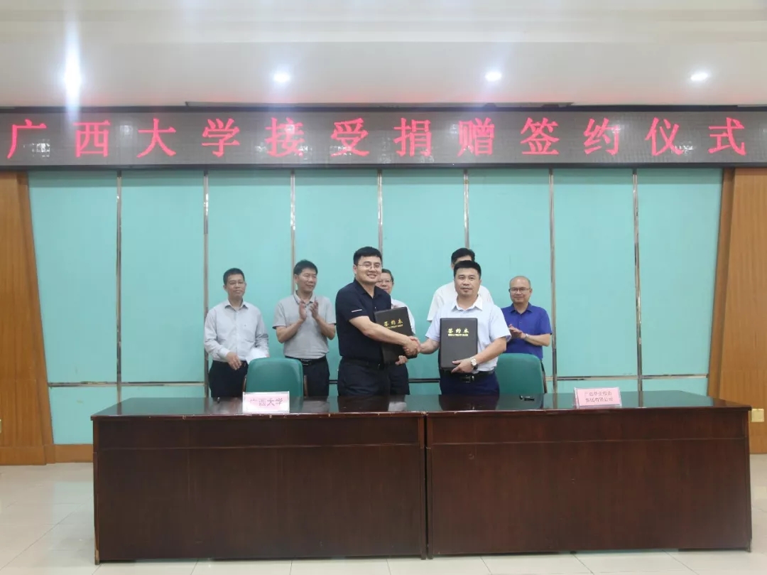 2018年5月4日,在廣西大學90周年校慶即將到來之際,廣西華業(yè)投資集團與廣西大學舉行捐贈簽約儀式及接受捐贈儀式。自治區(qū)政協(xié)副主席、廣西大學黨委書記劉正東,防城港市政協(xié)主席趙發(fā)旗、防城港市政協(xié)副主席、廣西大學防城港校友會會長彭景東,華業(yè)集團董事長龍其生、副總裁龐樹玉、工會主席鐘麗霞等領導出席了儀式。