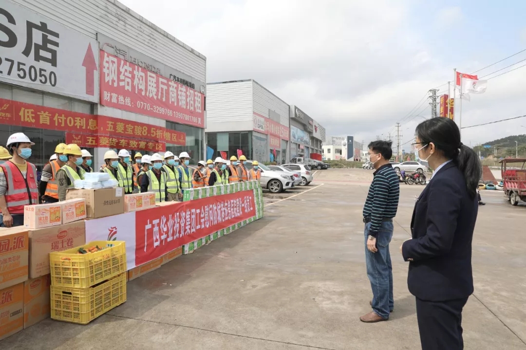 2020年2月15日,廣西華業(yè)投資集團(tuán)副總裁廖人興、工會(huì)主席鐘麗霞代表華業(yè)集團(tuán)在華業(yè)汽車(chē)城慰問(wèn)連日來(lái)奮戰(zhàn)在防城港市第一人民醫(yī)院感染性疾病科應(yīng)急負(fù)壓病房項(xiàng)目建設(shè)一線的員工,為他們送去牛奶、水果等慰問(wèn)品和防護(hù)用品,并鼓勵(lì)他們同心協(xié)力、一往無(wú)前,為抗擊疫情取得最終勝利添磚加瓦。