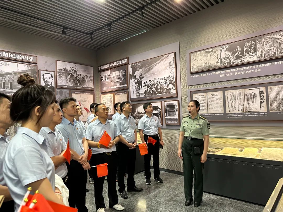 上午7時30分,全體人員統(tǒng)一于南寧乘車出發(fā),10時30分,抵達百色起義紀念園?;顒邮渍緸閳@內(nèi)百色起義紀念館,該館融合民族文化、民族符號于公共空間、展陳細節(jié),通過栩栩如生的浮雕展示、豐富的圖文事例及聲光影像,將百色起義和右江革命根據(jù)地斗爭的壯麗畫卷重現(xiàn)在人眼前,讓大家深切感受到了鄧小平等革命先輩們的信仰之堅定、革命之無畏,切實喚醒了參觀者的紅色記憶,激勵大家沿著革命先輩的足跡繼續(xù)前行,努力走好新時代的長征之路。據(jù)了解,百色起義紀念館內(nèi)含革命文物資料和圖片資料共計1400多件(幅)。